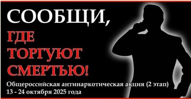 В соответствии с Планом основных организационных мероприятий МВД России с 13 по 24 октября 2025 года, в целях привлечения общественности к участию в противодействии незаконному обороту наркотиков и профилактике их немедицинского потребления, сбора и проверке оперативно-значимой информации, оказания квалифицированной помощи и консультаций по вопросам лечения и реабилитации наркозависимых лиц, проводится второй этап Общероссийской антинаркотической акции «Сообщи, где торгуют смертью».