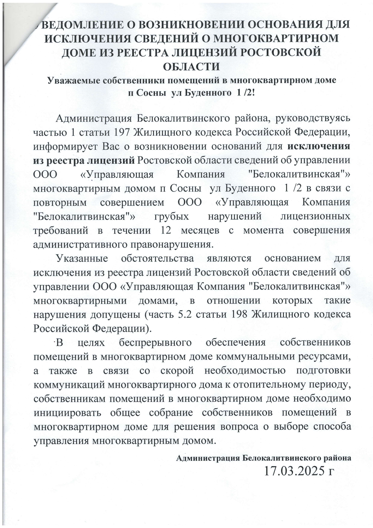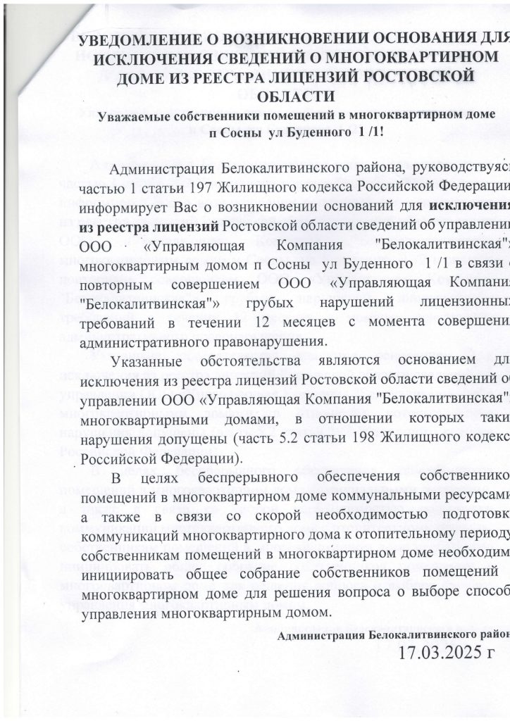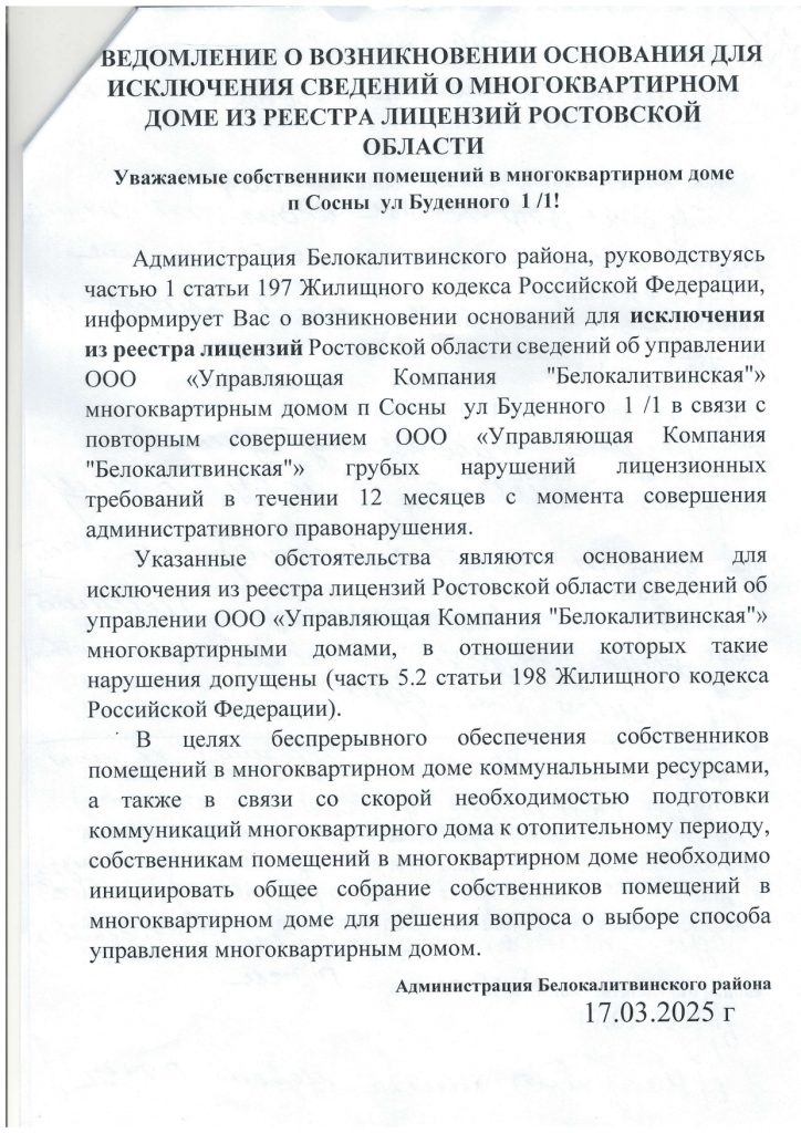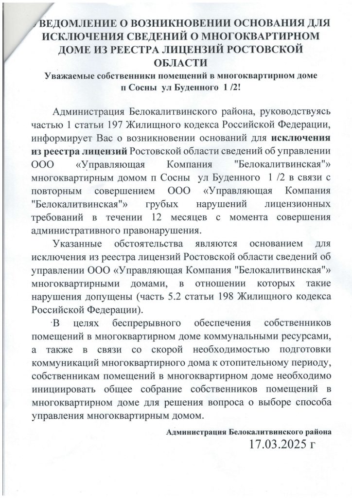 УВЕДОМЛЕНИЕ О ВОЗНИКНОВЕНИИ ОСНОВАНИЯ ДЛЯ ИСКЛЮЧЕНИЯ СВЕДЕНИЙ О МНОГОКВАРТИРНОМ ДОМЕ ИЗ РЕЕСТРА ЛИЦЕНЗИЙ РОСТОВСКОЙ ОБЛАСТИ